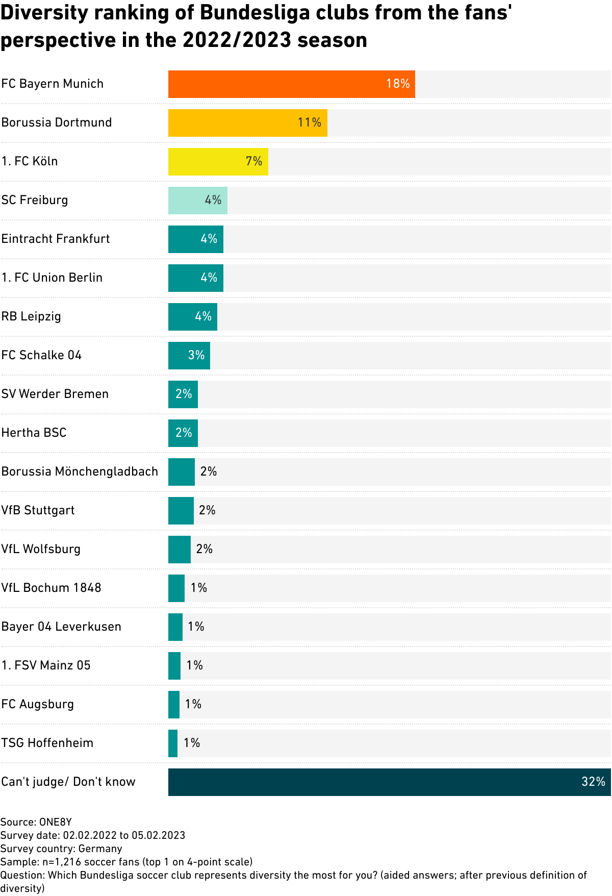 Which Bundesliga soccer club stands for diversity the most for you? (aided answers; preceding definition of diversity according to the Diversity Charter)