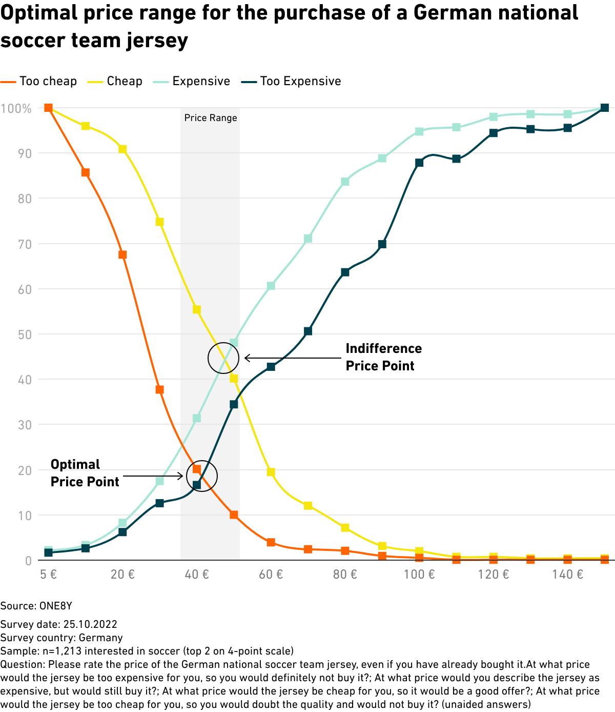 Please rate the price of the German national soccer team jersey, even if you have already bought it. At what price would the jersey be too expensive for you, so you would definitely not buy it?; At what price would you describe the jersey as expensive, but would still buy it?; At what price would the jersey be cheap for you, so it would be a good offer?; At what price would the jersey be too cheap for you, so you would doubt the quality and would not buy it? (unaided answers)