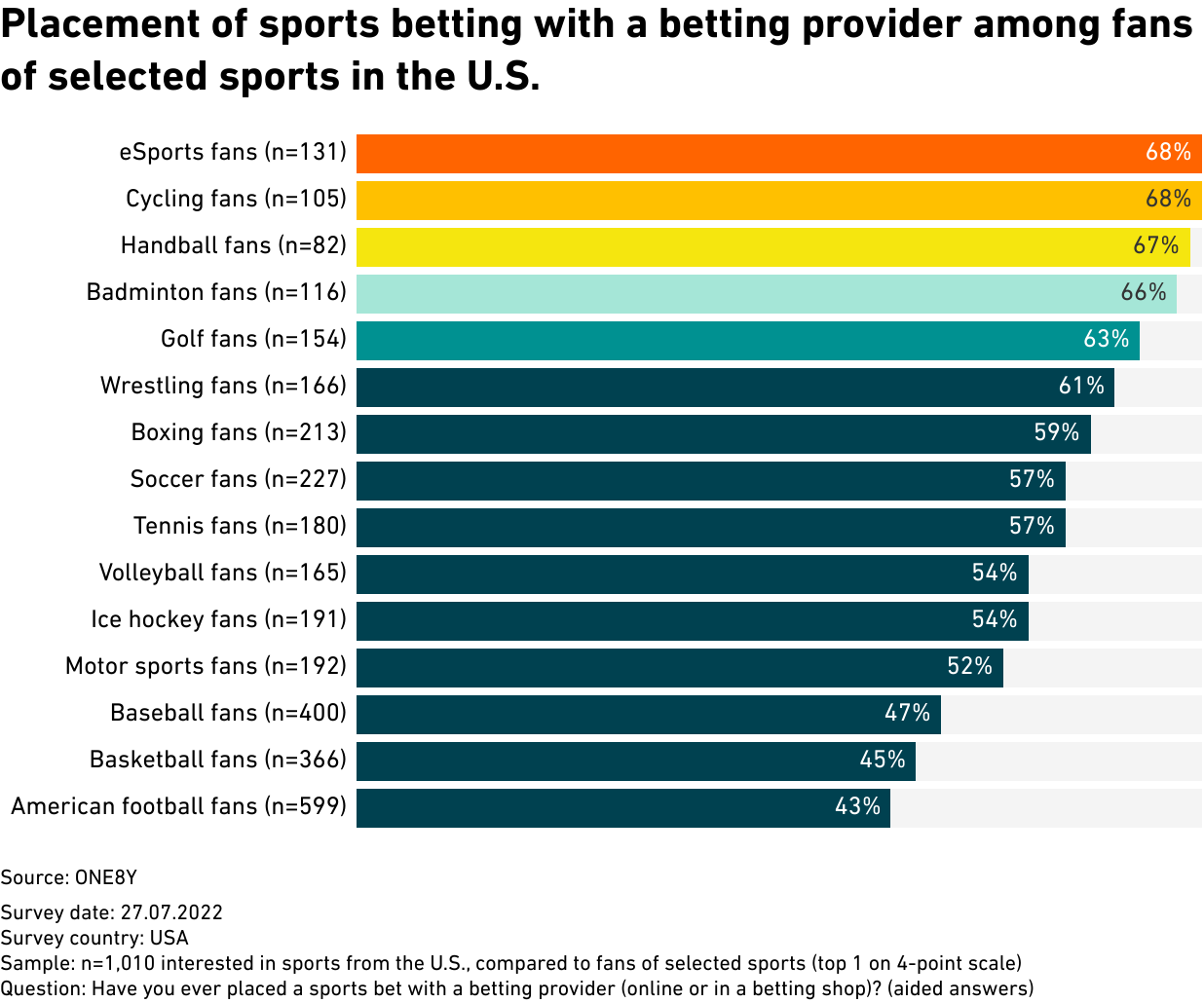 Placement of sports betting with a betting provider among fans of selected sports in the U.S.