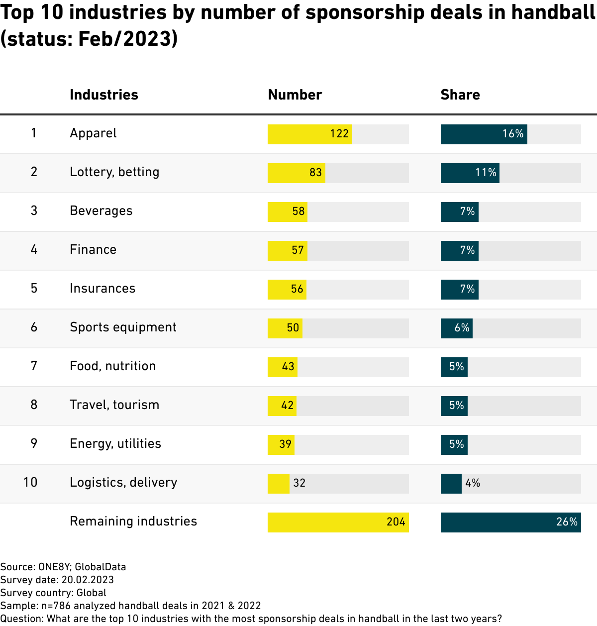 Top 10 industries by number of sponsorship deals in handball (status: Feb/2023)