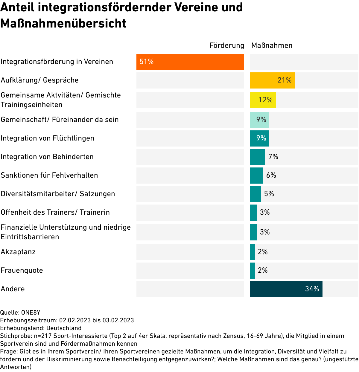 Gibt es in Ihrem Sportverein/ Ihren Sportvereinen gezielte Maßnahmen, um die Integration, Diversität und Vielfalt zu fördern und der Diskriminierung sowie Benachteiligung entgegenzuwirken? Welche Maßnahmen sind das genau? (ungestützte Antworten)