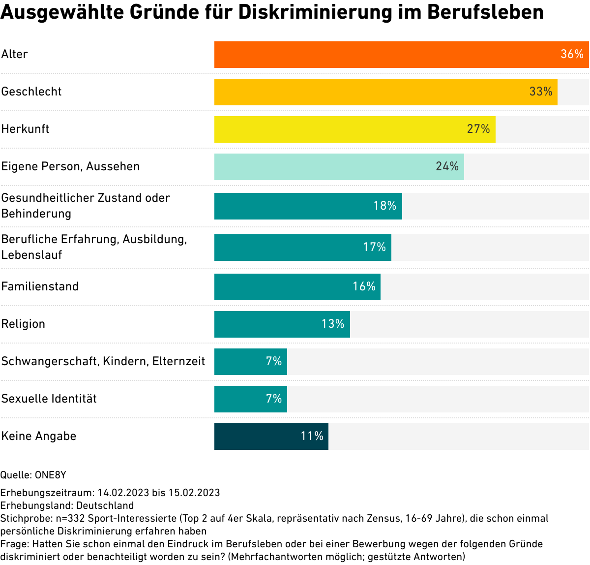 n=332 Sport-Interessierte (Top 2 auf 4er Skala, repräsentativ nach Zensus, 16-69 Jahre), die schon einmal persönliche Diskriminierung erfahren haben