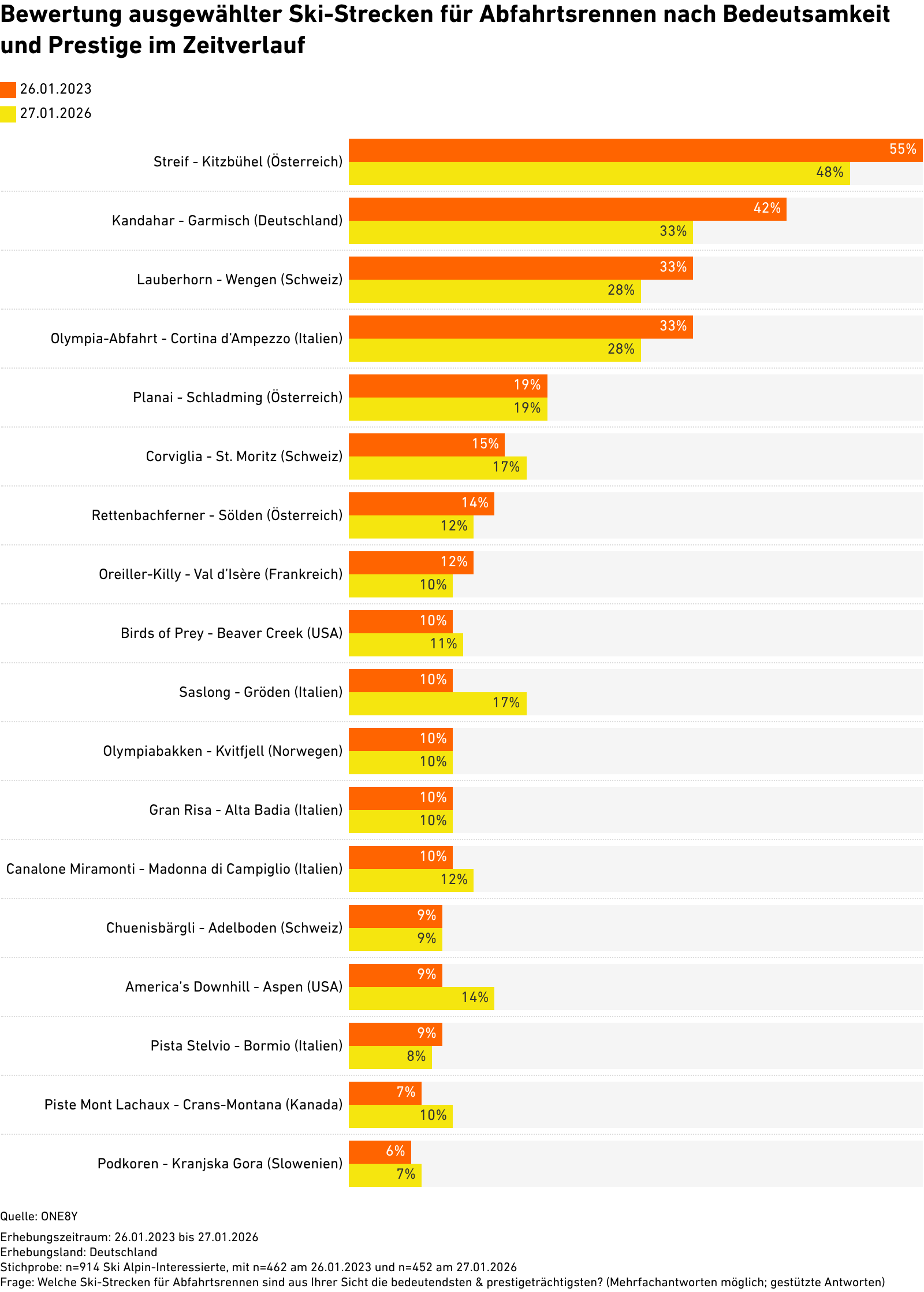 n=914 Ski Alpin-Interessierte, mit n=462 am 26.01.2023 und n=452 am 27.01.2026