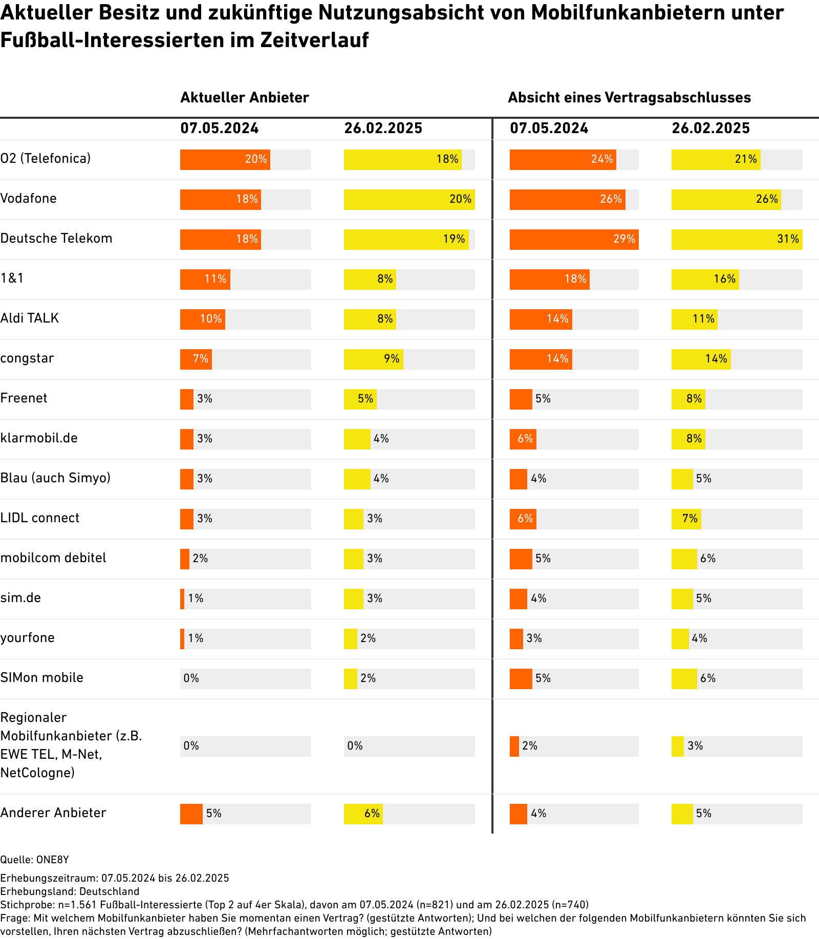 Aktueller Besitz und zukünftige Nutzungsabsicht von Mobilfunkanbietern unter Fußball-Interessierten im Zeitverlauf