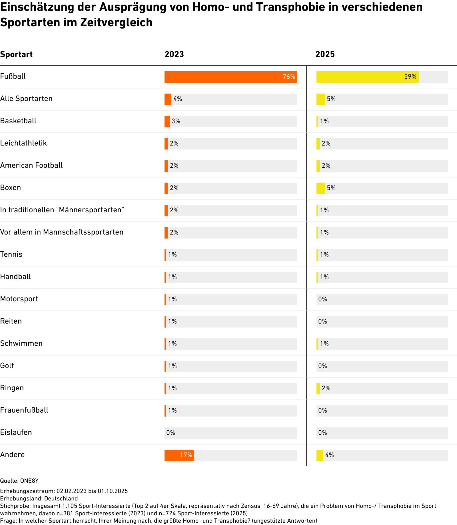 Insgesamt 1.105 Sport-Interessierte (Top 2 auf 4er Skala, repräsentativ nach Zensus, 16-69 Jahre), die ein Problem von Homo-/ Transphobie im Sport wahrnehmen, davon n=381 Sport-Interessierte (2023) und n=724 Sport-Interessierte (2025)