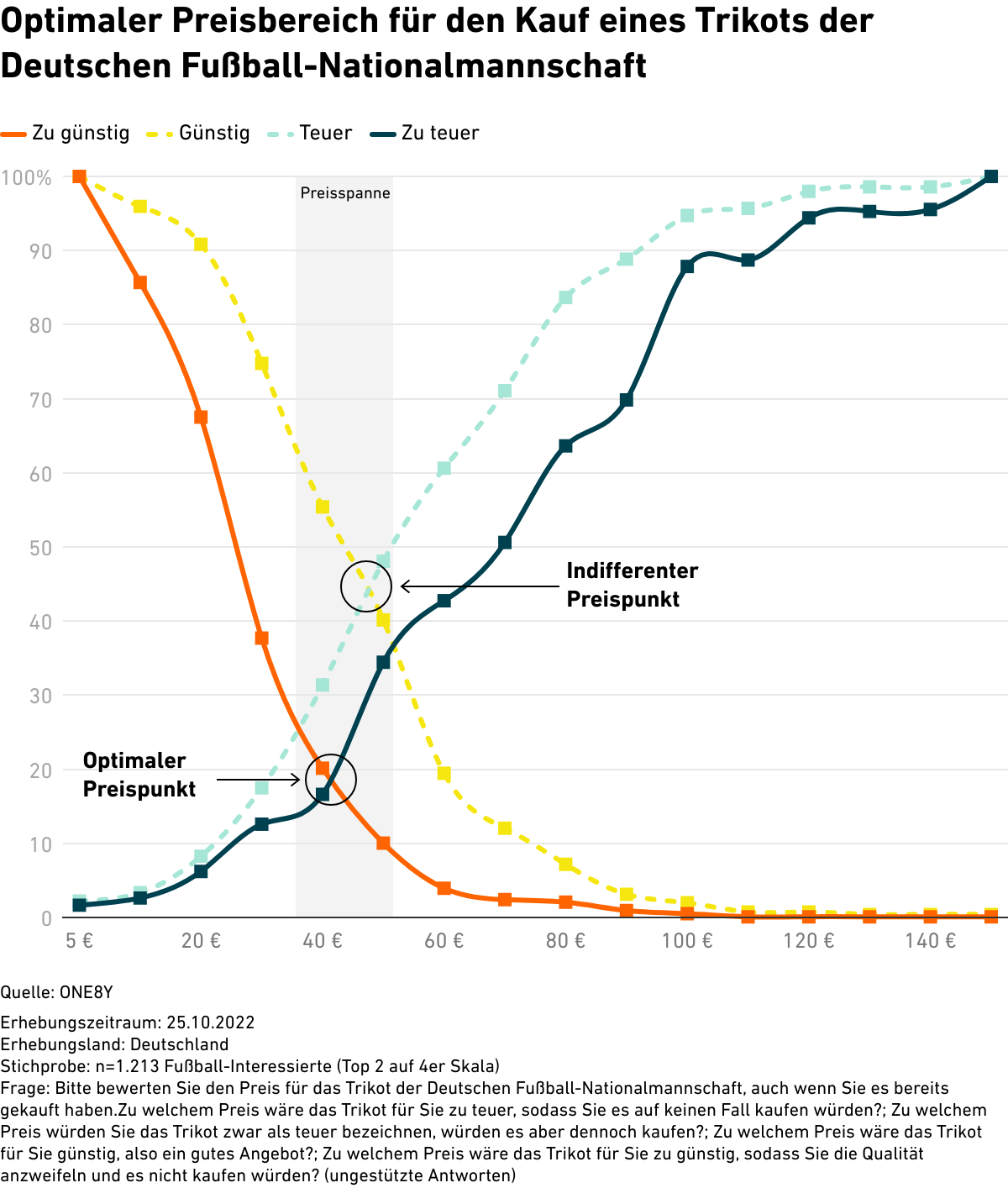 Bitte bewerten Sie den Preis für das Trikot der Deutschen Fußball-Nationalmannschaft, auch wenn Sie es bereits gekauft haben. Zu welchem Preis wäre das Trikot für Sie zu teuer, sodass Sie es auf keinen Fall kaufen würden?; Zu welchem Preis würden Sie das Trikot zwar als teuer bezeichnen, würden es aber dennoch kaufen?; Zu welchem Preis wäre das Trikot für Sie günstig, also ein gutes Angebot?; Zu welchem Preis wäre das Trikot für Sie zu günstig, sodass Sie die Qualität anzweifeln und es nicht kaufen würden? (ungestützte Antworten)
