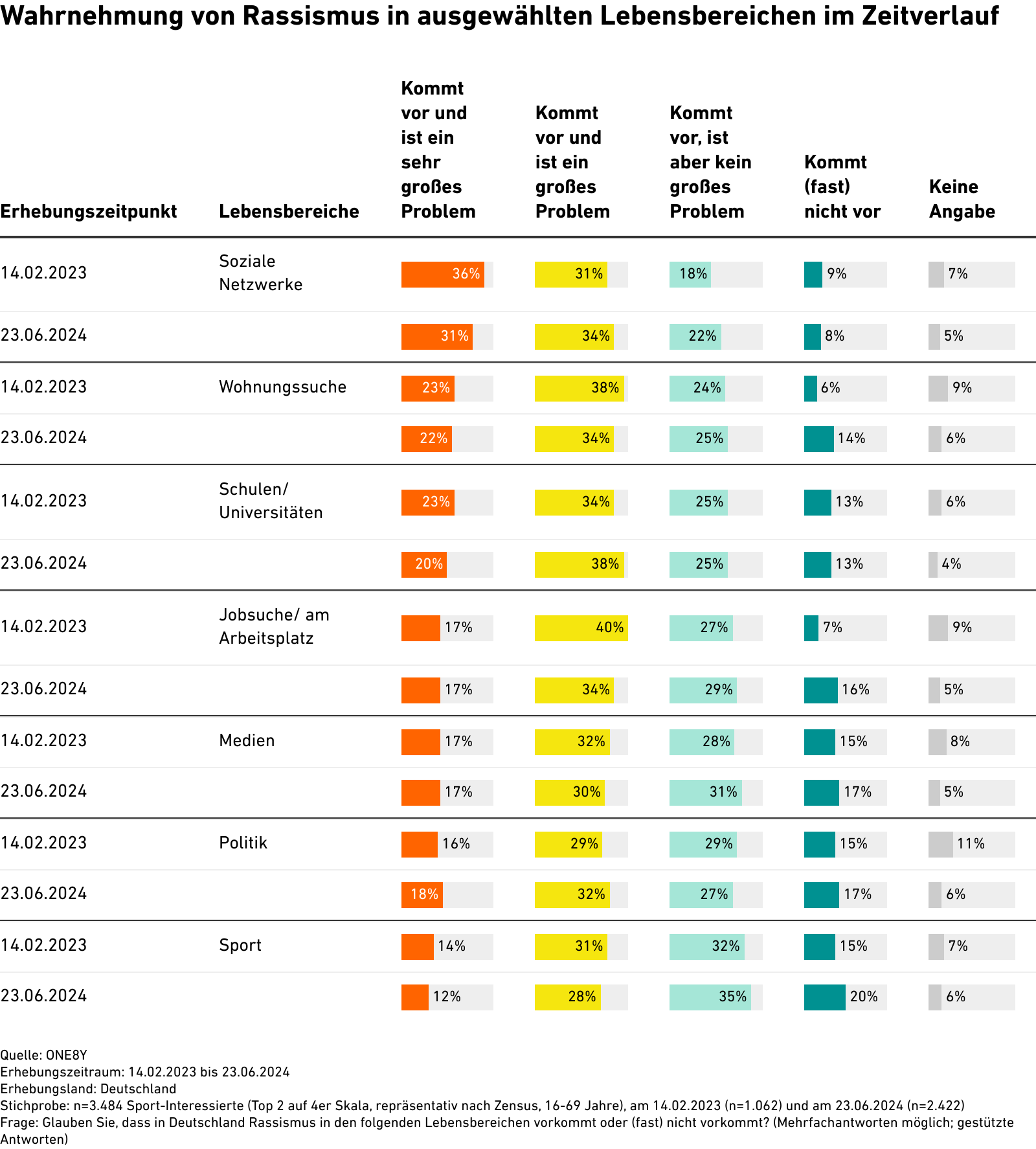 Wahrnehmung von Rassismus in ausgewählten Lebensbereichen im Zeitverlauf